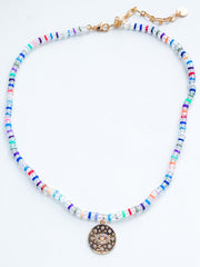 Protect Mí Beads - Evil Eye choker necklace is made up of delicate clear beads with flat colored beads for that pop! It’s Diamond evil eye pendant makes this easy to mix with Luther gold necklaces! Wear with our Herringbone Choker for the perfect look!