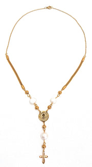 Our Saint Benedict Pearl Rosary gives us a twist to our classic rosary. From the pearl details to the Saint Benedict pendant. This unique piece is perfect alone or layered wit our Thickum Herringbone.